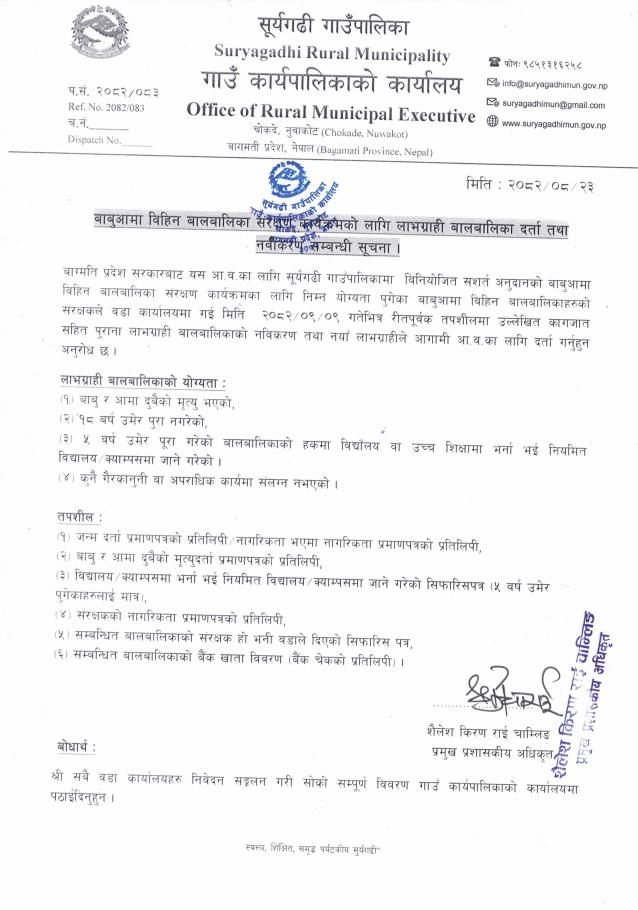 बाबुआमा विहिन बालबालिका संरक्षण कार्यक्रमको लागि लाभग्राही बालबालिका दर्ता तथा नवीकरण सम्बन्धी सूचना।