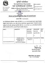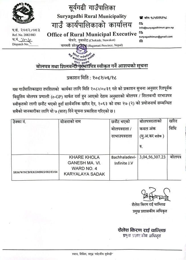 बोलपत्र तथा शिलबन्दी दरभाउपत्र स्वीकृत गर्ने आशयको सूचना!!! (खारे खोला गणेश मा.वि. वडा नं. ४ कार्यालय सडक)