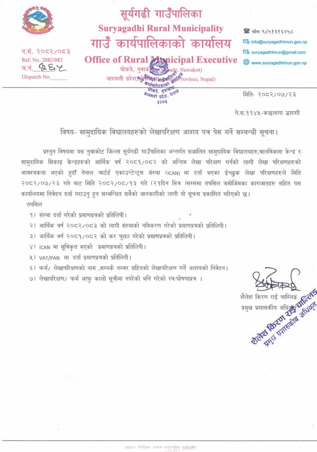 सामुदायिक विद्यालयहरुको लेखापरिक्षण आशय पत्र पेश गर्ने सम्बन्धी सूचना!!!