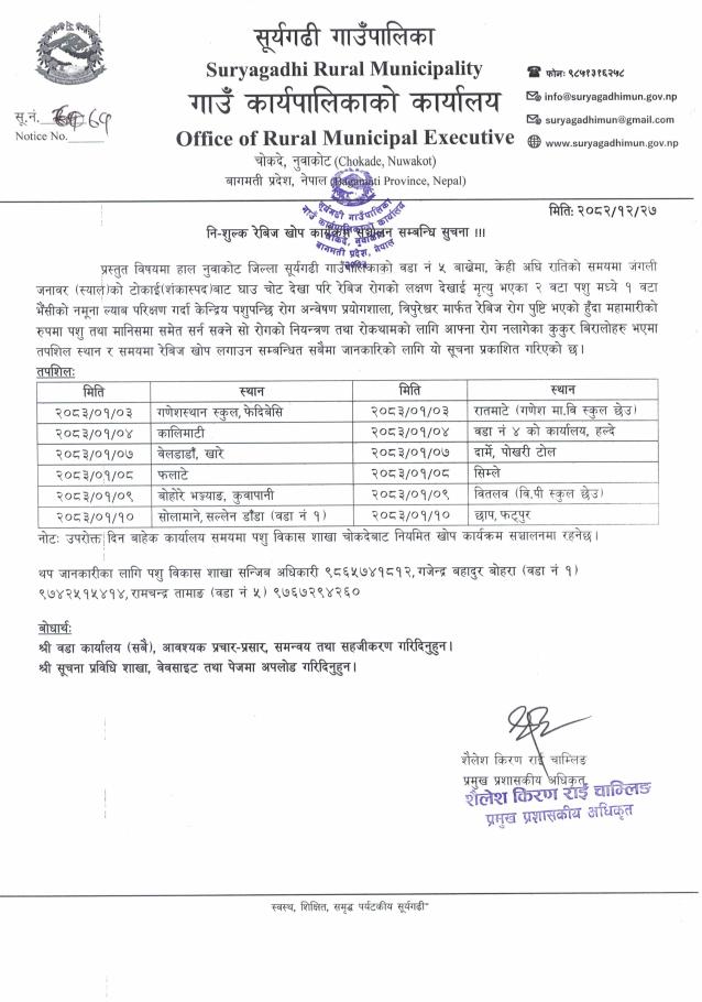 नि:शुल्क रेविज खोप कार्यक्रम सञ्चालन सम्बन्धी सूचना।