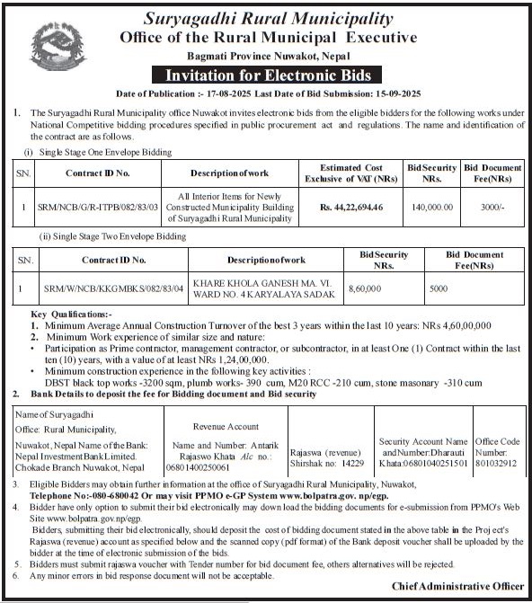 Invitation for Electronic Bids (Interior for Newly Constructed Building) and Khare Khola sadak