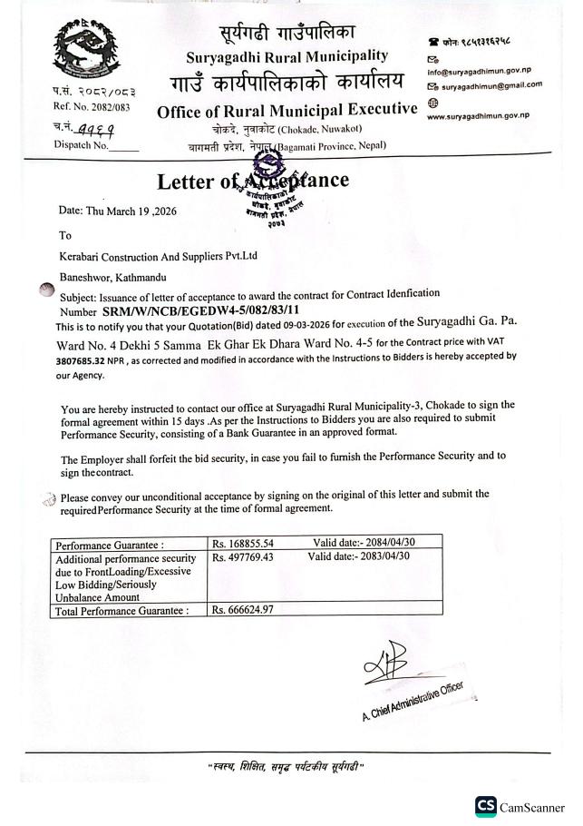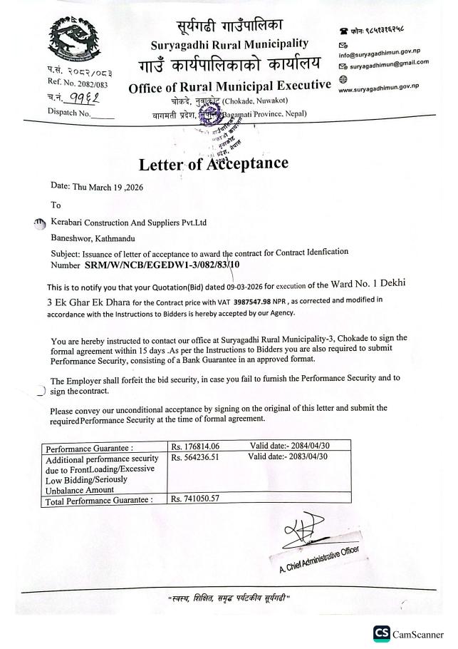 Letter of Acceptance (Ward No. 1 Dekhi 3 Ek Ghar Ek Dhara) and (Suryagadhi Ga.Pa. Ward No. 4 Dekhi 5 Samma Ek Ghar Ek Dhara)
